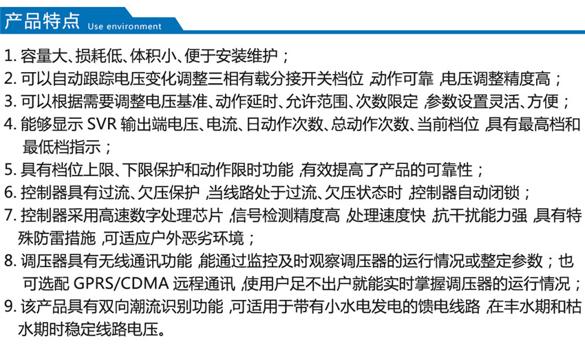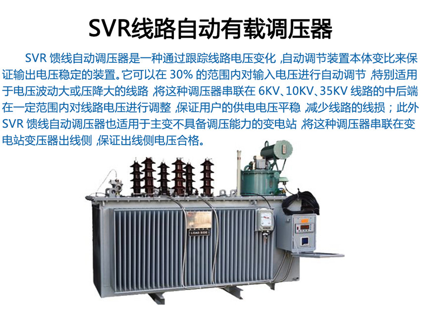 我公司生產(chǎn)的SVR型線路自動調(diào)壓變壓器原理是SVR與10kV 柱上無功自動補(bǔ)償裝置GWJ配合使用,可有效地解決線路電壓低及無功電源不足的問題。SVR 能有效地調(diào)節(jié)電路電壓, GWJ無功補(bǔ)償裝置能有效補(bǔ)償無功,提高功率因數(shù),降低線損,其效果相當(dāng)于一個(gè)簡易的柱上變電站,而造價(jià)僅為常規(guī)變電站的1/6~1/10。而成本只有變電站的1/6,1/7,而且無需工作人員值班維護(hù)。