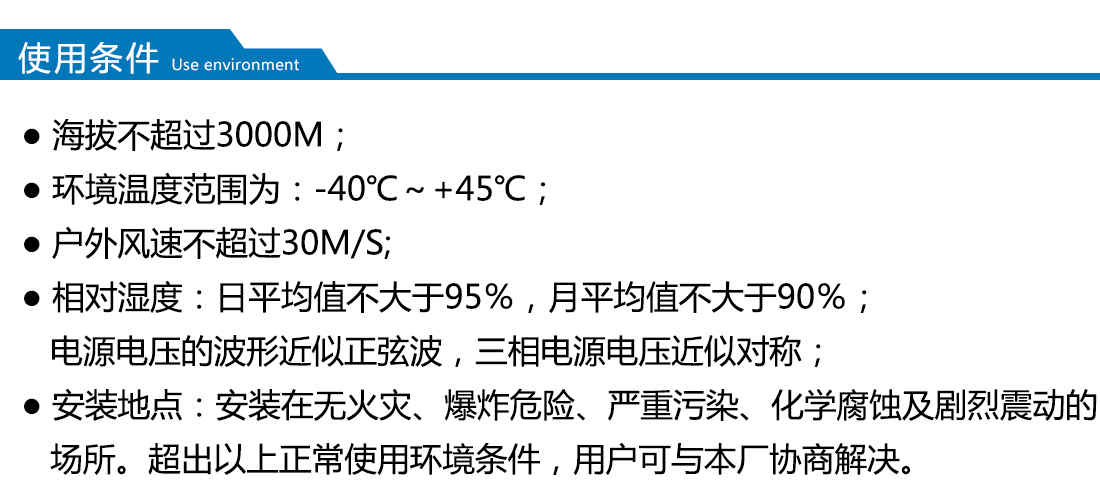 適用于自然條件比較惡劣的海灘、草原、荒漠等無火災(zāi)、無嚴(yán)重污染、無化學(xué)腐蝕介質(zhì)和粉塵、無爆炸性危險運行環(huán)境,可用于戶外、又可用于戶內(nèi)。