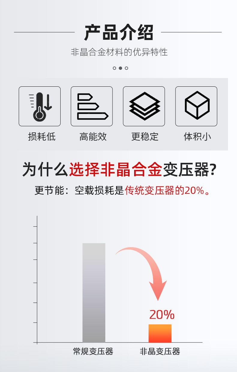 該變壓器的鐵芯采用非晶合金材料,相比傳統(tǒng)的硅鋼片材料,其磁導(dǎo)率高,鐵損耗低,磁飽和感低,從而使得變壓器的效率得到了進(jìn)一步提高。另外,非晶合金材料在加工時可以制成形狀各異的薄帶狀材料,鐵芯損耗低,結(jié)構(gòu)緊湊,提高了變壓器的功率密度,進(jìn)一步減小了變壓器的體積和重量。